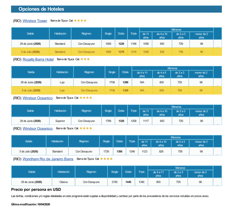 - Tasas e impuestos USD 109 - Sujeto a modificación al momento de la emisión