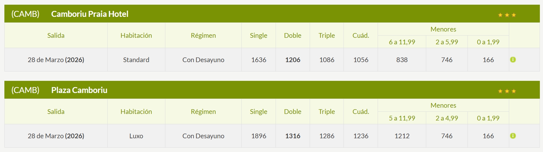 Las tarifas, condiciones y/o reglas detalladas en este programa están sujetas a disponibilidad y cambios por parte de los proveedores de los servicios incluídos sin previo aviso. Los precios de menores corresponden a un menor compartiendo habitación con dos adultos.