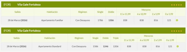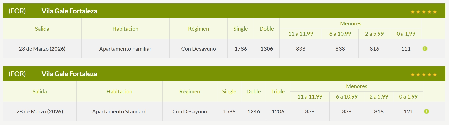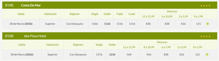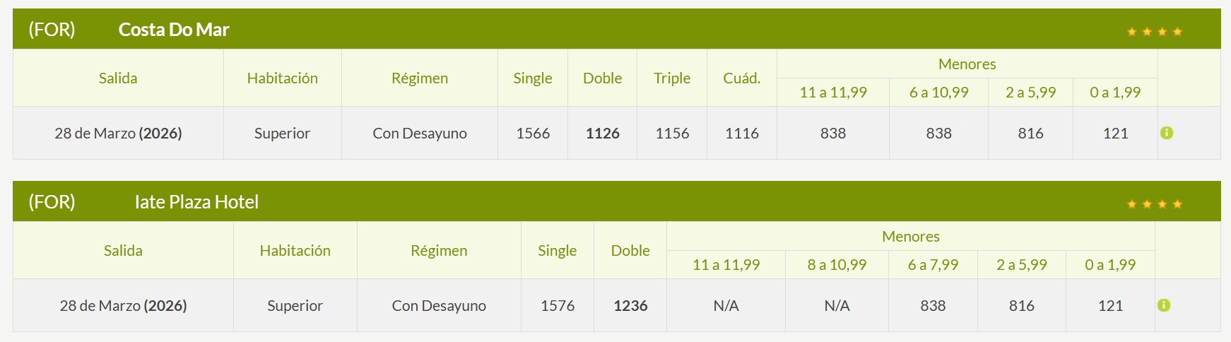 Las tarifas, condiciones y/o reglas detalladas en este programa están sujetas a disponibilidad y cambios por parte de los proveedores de los servicios incluídos sin previo aviso. Los precios de menores corresponden a un menor compartiendo habitación con dos adultos.