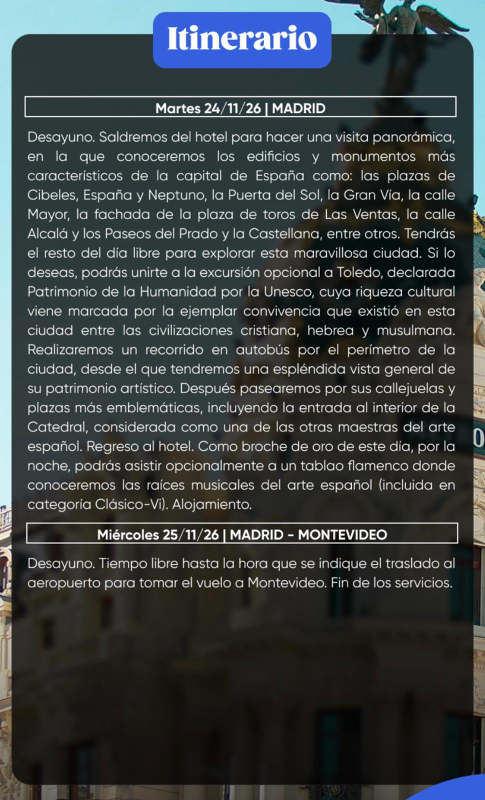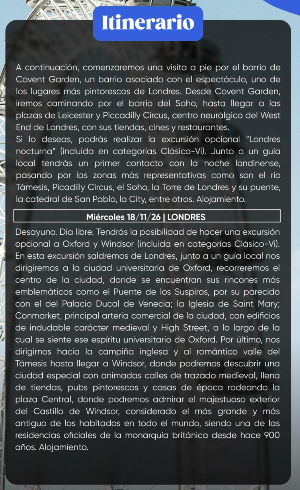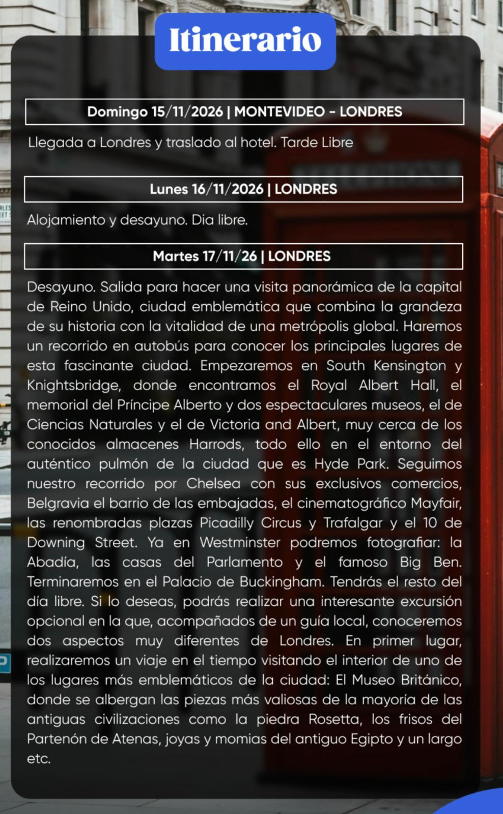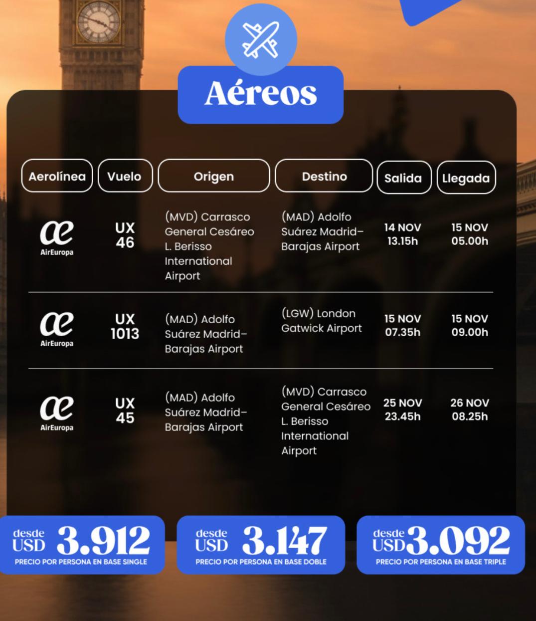 * Aéreo con Air Europa Montevideo / Londres / Madrid / Montevideo. Equipaje en bodega 23 kg.