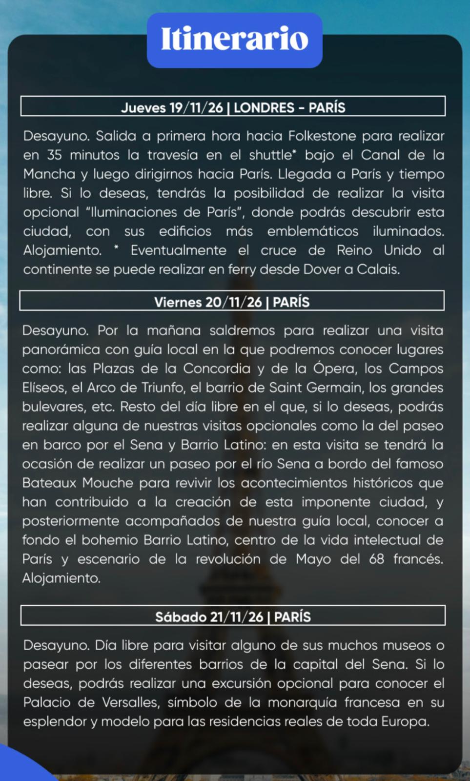* Visitas panorámicas de Londres, Paris y Madrid con guía local.