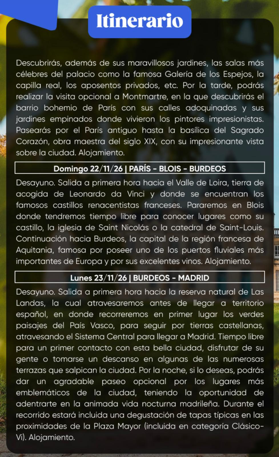 * Otros lugares comentados por nuestro guía: Blois y Burdeos.