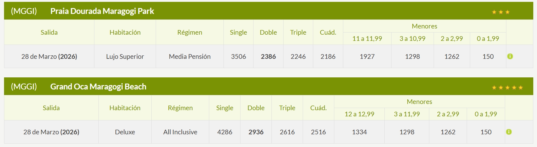 Las tarifas, condiciones y/o reglas detalladas en este programa están sujetas a disponibilidad y cambios por parte de los proveedores de los servicios incluídos sin previo aviso. Los precios de menores corresponden a un menor compartiendo habitación con dos adultos.