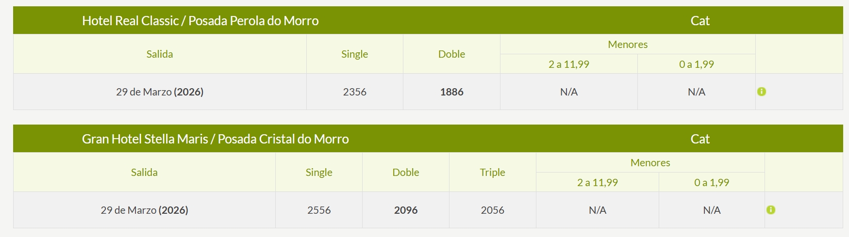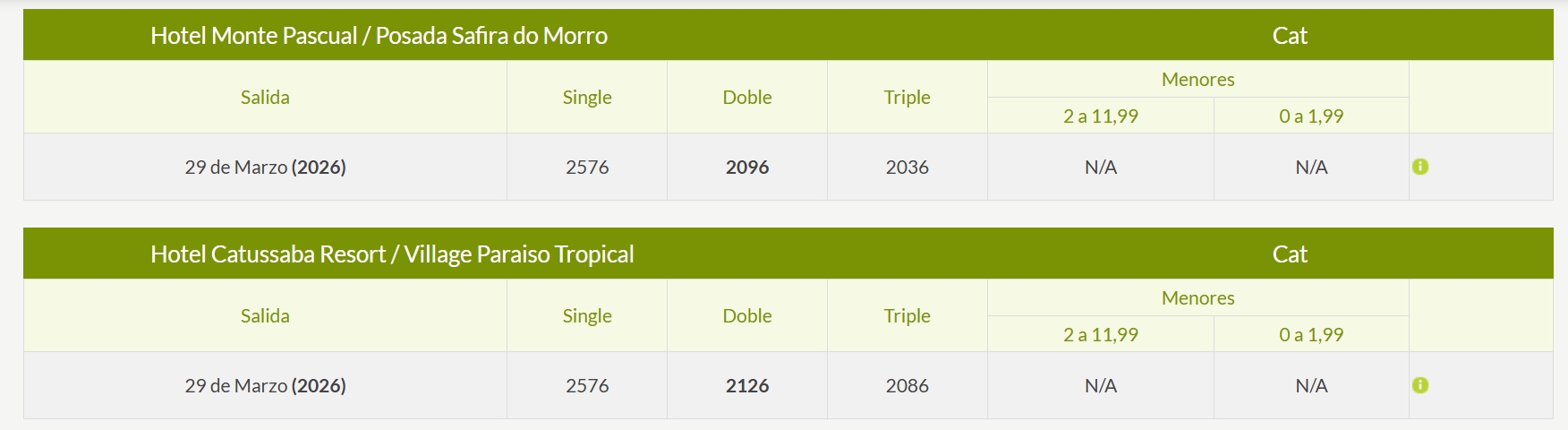 Las tarifas, condiciones y/o reglas detalladas en este programa están sujetas a disponibilidad y cambios por parte de los proveedores de los servicios incluídos sin previo aviso. Los precios de menores corresponden a un menor compartiendo habitación con dos adultos.