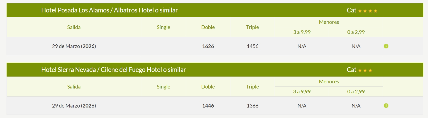 Las tarifas, condiciones y/o reglas detalladas en este programa están sujetas a disponibilidad y cambios por parte de los proveedores de los servicios incluídos sin previo aviso. Los precios de menores corresponden a un menor compartiendo habitación con dos adultos.