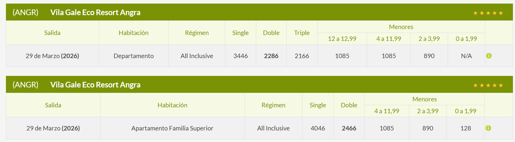 Las tarifas, condiciones y/o reglas detalladas en este programa están sujetas a disponibilidad y cambios por parte de los proveedores de los servicios incluídos sin previo aviso. Los precios de menores corresponden a un menor compartiendo habitación con dos adultos.
